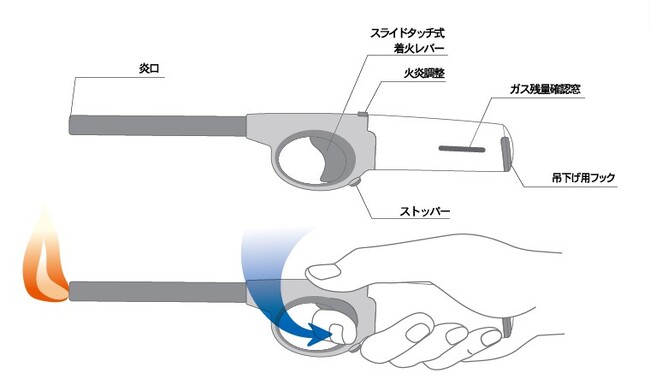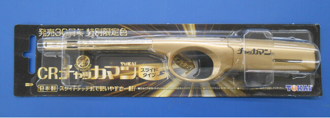 チャッカマンゴールドのモデルには着火レバーの先端を奥にスライドさせることで着火できるスライドタイプを採用。スライドタイプはチャイルドレジスタンス機能を持ちながらも、従来の着火レバー全体を押し込むハードプッシュ式よりも指が痛くなりづらく、軽い力で火がつくのが特徴です。チャッカマンゴールドは見た目だけでなく使いやすさも兼ね備えた優れものです。