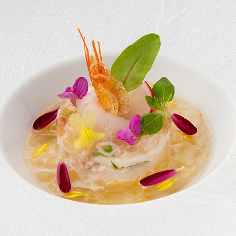 日本海に面する福井県は、豊かな自然環境に恵まれ、四季折々の海の幸・山の幸を味わうことができます。濃厚な甘みが人気の「福井県産甘えび」にロゼスパークリングのジュレを添え、見た目も華やかに仕上げるフランス料理の前菜や、福井県産ブランド牛「三ツ星若狭牛」を料理人の技で最高の状態に焼き上げる鉄板焼、冬の味覚の王様「越前がに」を堪能する会席料理など、バラエティ豊かなメニューを揃えます。