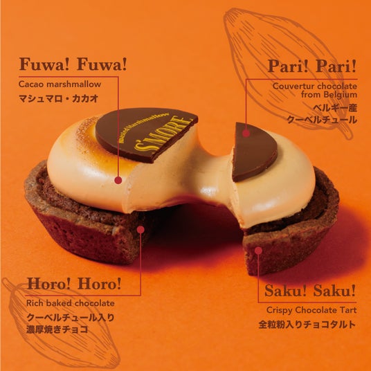 『焼マシュマロ・タルト スモア (S’MORE)』発売から6年、さまざまな限定フレーバー【バナナ味】、【あまおう苺味】、【抹茶味】、【Wチョコ】、【東京レモン】、【リッチストロベリー】と地域の特産やこだわりの素材を活かして商品化してきました。今回販売する新フレーバーはマシュマロと相性ぴったりなチョコレートを様々なスイーツにして組み合わせた【The Best チョコレート】。再びANA FESTAのスタッフが商品づくりに参加し、何度も試作を重ねた末に完成した逸品です。 濃厚かつ香り豊かなチョコレートの美味しさを様々なスイーツに変化させ、当店自慢のマシュマロと合わせたBest match!(ベストマッチ!)なチョコフレーバーです。ココアを練り込んだ香ばしいグラハムタルト、ベルギー産クーベルチュールをブレンドした焼きチョコ、『S’MORE』ロゴの入ったメダルチョコレートにもベルギー産クーベルチュールを使用。チョコレートのコク深い香りがとろけだす、チョコ好きにはたまらないマシュマロスイーツに仕上げました。