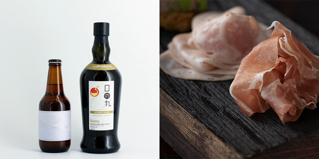 画像左より)常陸野ネストビール malcaラガー、日の丸ウイスキー Svoltaオリジナルブレンドシングルモルトウイスキー、常陸野ハムBARREL SMOKE