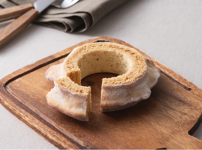 当式場は「思い出の場所は はじまりの場所となり 永遠の場所に変わる」というコンセプトストーリーを掲げ、新郎新婦様が結婚式を挙げた後も10年、20年経っても帰って来ることができる場所を目指しています。このコンセプトストーリーを実現していくためにも、結婚式場として持続可能な社会を目指す取り組みが必要であると考え、フードロス削減を目的として、本来廃材となってしまう国産の「米粉」や「バターミルク」を使用したサステナブルなバウムクーヘンを開発しました。生地は芳醇なバターの薫りとしっとりとした食感でありながら、外側はザクッとした食感が楽しめます。