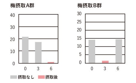梅摂取は同意したボランティアを梅摂取A群、梅摂取B群の2群に分けて6週間実施しました。前半の3週間において、梅摂取A群は通常どおりの食生活で過ごし、梅摂取B群は弊社梅抽出物製品(以下梅抽出物製品とする)を1日2回(昼食・夕食時)摂取しました。後半の3週間は、梅摂取A群が梅抽出物製品を1日2回摂取し、梅摂取B群は梅抽出物製品の摂取をやめ、通常どおりの食生活で過ごしました。