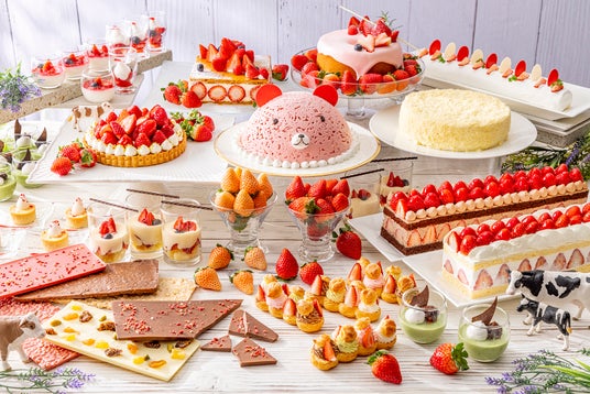 いちごのタルト、くまのいちごモンブラン、いちごのミルフィーユ、パンナコッタ、クレームダンジュ、いちごのロマノフ、いちごショートケーキ、いちごチョコレートショートケーキ、いちごのロールケーキ、4種のシュートレイン、いちごのシフォンケーキ、抹茶パンナコッタ、北海道レアチーズケーキ、北海道チーズタルト、かちわりチョコレート、ドーナッツウォール、チョコレートファウンテンなどWEBサイト、オンライン予約はこちら