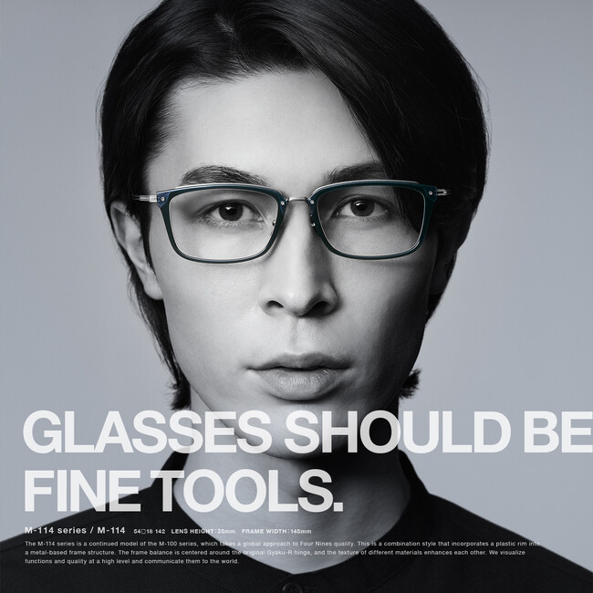 M-114シリーズはフォーナインズ クオリティをグローバルにアプローチする、M-100シリーズの継続モデル。メタルをベースとしたフレーム構造にプラスチックリムを組み込んだコンビネーションスタイル。独自機構の逆Rパーツを軸としたフレームバランスと異なる素材同士が高め合う質感。機能と品質を高い次元で視覚化し、世界に向けて発信します。スクエアとクラウンパントの2型展開。