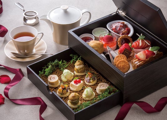 宝石箱に見立てた2段のBOXの上段にはスイーツ11品10種。下段にはセイボリー9品を美しく配置。ベリーツの特徴を生かしつつ、ミルフィーユ、ムース、タルト、クリームクッキーサンド、プリン、フレンチトースト、コンフィチュールなど、食感と味わいの異なるベリーツを使った10種のスイーツを楽しめます。