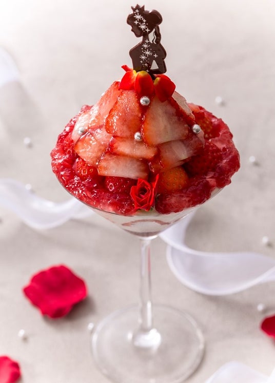 また、ベリーツの美しさから「苺のプリンセス」をイメージしたパフェ「Robe rouge(ローブ ルージュ)」は、ベリーツの深紅と白い断面のコントラストを活かしてドレスのプリーツを造形。また、ベリーのゼリーをフリルに見立て、ゴージャスに仕立てました。