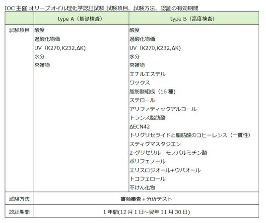 IOC主催 オリーブオイル理化学認証試験 試験項目、試験方法、認証の有効期間