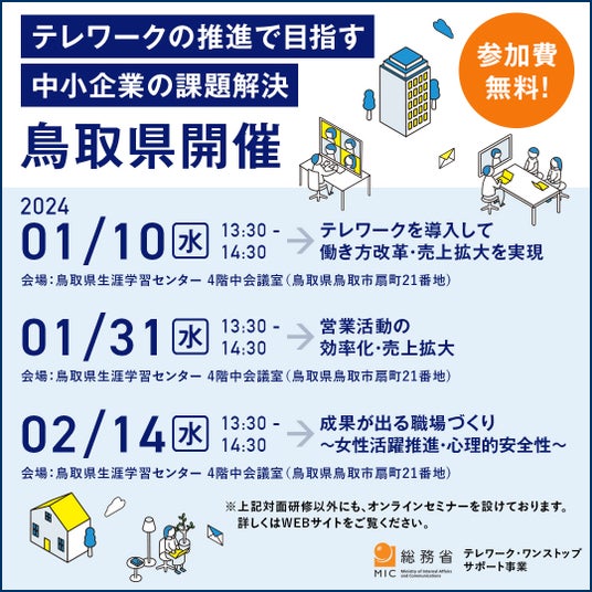 総務省 テレワーク・ワンストップ・サポート事業 地域窓口事務局(受託者:有限責任監査法人トーマツ)は、鳥取県で全4回にわたりテレワークの推進のためのセミナーを開催いたします。