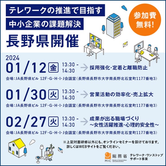 総務省 テレワーク・ワンストップ・サポート事業 地域窓口事務局(受託者:有限責任監査法人トーマツ)は、長野県で全4回にわたりテレワークの推進のためのセミナーを開催いたします。