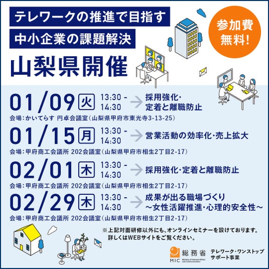 総務省 テレワーク・ワンストップ・サポート事業 地域窓口事務局(受託者:有限責任監査法人トーマツ)は、山梨県で全5回にわたりテレワークの推進のためのセミナーを開催いたします。
