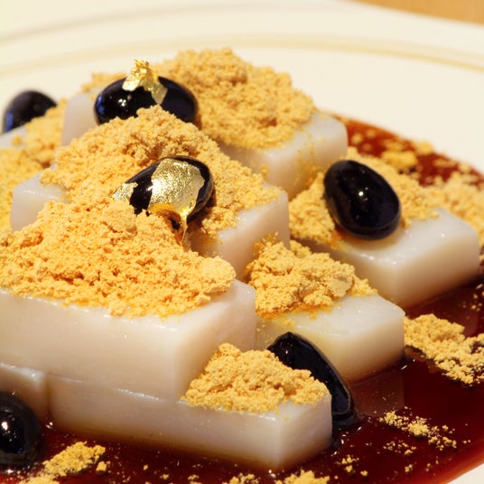 もっちりとした食感と発酵ならではの酸味を感じられる船橋屋のくず餅。沖縄県産の黒糖をベースにした黒蜜と粗めに挽いた香ばしいきな粉をかければ、唯一無二の美味しさをお楽しみいただけます。そしてじっくり煮詰めた黒豆と、豪華な金箔を加えることでお正月ならではのスペシャルver.に。亀戸天神社で初詣のあとは、船橋屋亀戸天神前本店にて特別な時間をお過ごしください。