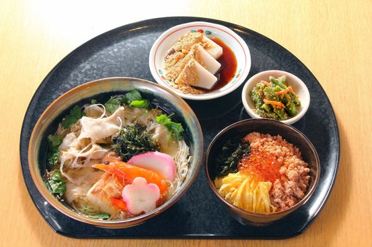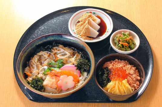 海老や焼餅、かまぼこを入れてお雑煮風に仕立てたにゅう麺※、鮭いくらが乗った4色の小どんぶり、小鉢と船橋屋看板商品のくず餅3切れが付いたお正月限定のセットです。あさり仕立て・梅豚仕立ての2種類がございますので、お好みに合わせてご注文いただけます。