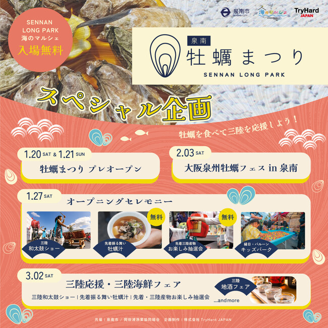 泉南牡蠣まつりのオープンを華やかに飾る「三陸和太鼓ショー」や、泉南市長や来賓の方をお招きしてのオープニングセレモニーを実施。またオープンを祝して、通常より大幅に提供数を増やした「先着300名限定振る舞い牡蠣汁」や来場者はもれなくご参加頂ける「三陸物産お楽しみ抽選会」など無料でご参加頂ける企画もご用意!また当日は会場に縁日やバルーン遊具などキッズパークもやってくる♪