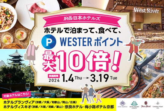 株式会社ジェイアール西日本ホテル開発(京都府京都市下京区、代表取締役社長 伊勢 正文)は、展開するJR西日本ホテルズの全11ホテルにて、WESTERポイントの付与が最大10倍になる「WESTERポイント最大10倍キャンペーン」を、2024年1月4日(木)より実施します。