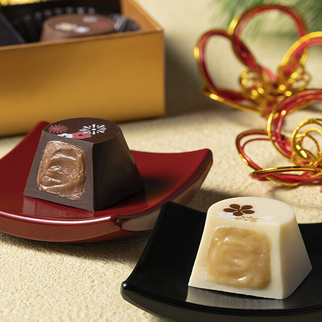新しい年のご多幸を願って、2024年の干支「辰」をデザインしたボックスに、フラワーモチーフが描かれた限定ヘーゼルナッツプラリネのミルクチョコレートやキャラメル ガナッシュのダークチョコレートなどを詰め合わせました。パッケージは、新年らしい赤色のベースカラーに、勇ましく優雅な2024年の干支“辰”や、新年の祝賀ムードを表す花火をデザインし、新年の華やかさを表現しました。