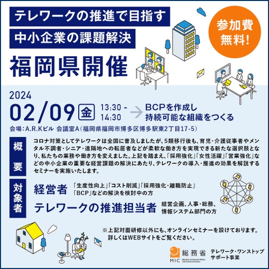 総務省 テレワーク・ワンストップ・サポート事業 地域窓口事務局(受託者:有限責任監査法人トーマツ)は、福岡県でテレワークの推進のためのセミナーを開催いたします。