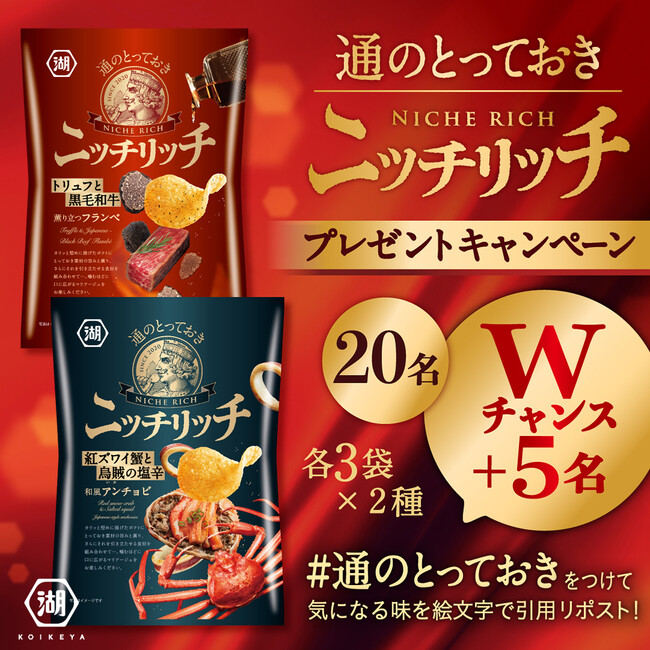 4年目となる「ニッチリッチ」の発売を記念して、当商品をみなさまにもっと知っていただきたい、食べていただきたいとの思いから、2品をセットにしてプレゼントするキャンペーンを実施します。X(旧Twitter)のフォロー&リポストで簡単にご応募できますが、「#通のとっておき」をつけて、気になる味を絵文字で引用リポストしていただくと、Wチャンスにも合わせてご応募できます。みなさまの推しの味をぜひ教えてください!