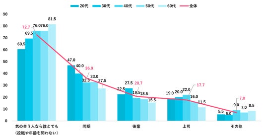 仕事関係で飲み会をしたい相手は、「気の合う人なら誰とでも(役職や年齢を問わない)」が全体の約7割となった。20代では「同期」が47.0%と、他の年代と比較して最も高い。