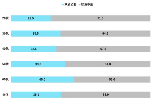 仕事関係の飲み会で「飲酒不要」派は20代で71.5%、60代では55.0%と世代間に差がみられる