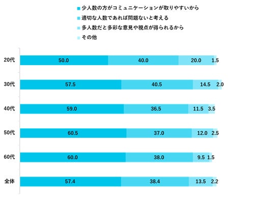 仕事関係の飲み会における理想の人数は、「5人以下」が全年代でトップとなった。理由として、「少人数の方がコミュニケーションが取りやすいから」が全体で57.4%だった。