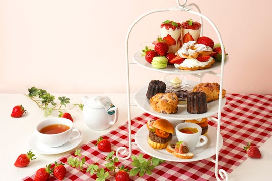 中段の苺とホワイトチョコレートの風味が口の中で広がるスコーンは、甘酸っぱいフランボワーズジャムと共にお召しあがりください。下段のプレートに並ぶセイボリーは、定番のミニステークアッシェバーガーと、生ハムの塩味がスイーツの甘味を中和してくれるタルティーヌや、野菜の食感を楽しむために少し大きめにカットした“食べるスープ”をご用意しました。