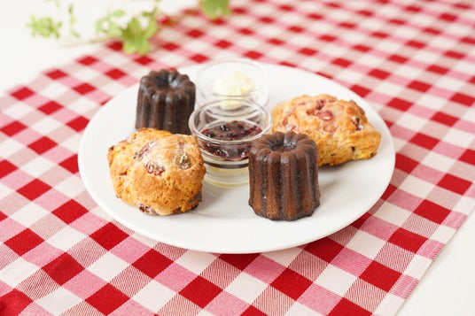 中段:苺とホワイトチョコの自家製スコーン(クロテッドクリーム、フランボワーズジャム)、カヌレ・ド・ボルドー