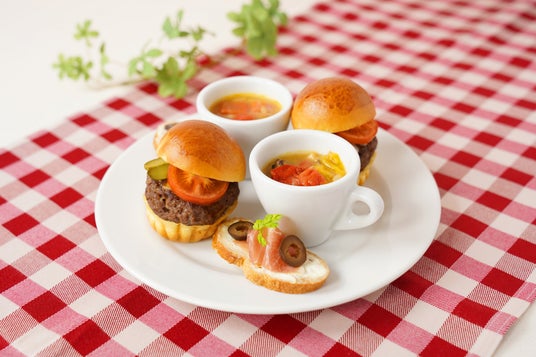 下段:お野菜ごろごろスープ、クリームチーズと生ハムのタルティーヌ、ミニステークアッシェバーガー