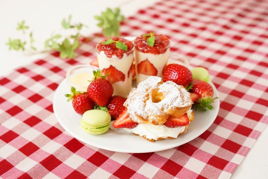 そして今年新しくメニューに加わったのは、フランスの首都パリと西部の都市ブレスト間で行われた世界最古の自転車レースにちなんで作られたフランス伝統菓子をアレンジした「苺のパリブレスト」。軽い食感のシュー生地に、濃厚なカスタードクリームにふんわりと泡立てたクレームシャンティー、あまおう苺を重ね合わせました。あまおう苺の甘酸っぱさが口の中をさっぱりとさせることで軽く食べられてしまう美味しさです。このほか、ガラスの器からのぞく苺を引き立てる真っ白なマスカルポーネのムースの上に苺のゼリーをのせ、下層のクランブルが食感のアクセントになることで、様々な味わいが楽しめるヴェリーヌがプレートを彩ります。