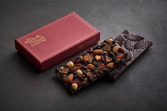 いちじくやアプリコット、クランベリーなどのドライフルーツと、アーモンドやヘーゼルナッツ、ピスタチオなどを贅沢に敷き詰めた、魅惑のチョコレートバー。裏面にはマンダリン オリエンタルのロゴがあしらわれ、ドライフルーツの酸味とナッツの香ばしさが、カカオの風味を引き立てます。