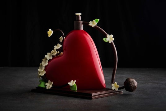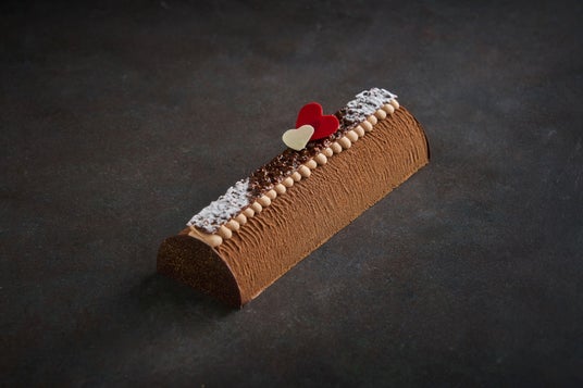 濃厚で滑らかなチョコレートと華やかなパッションフルーツの酸味が織りなす、上品なチョコレートテリーヌ。可愛らしいハートと、サクサクとした食感が特徴的なカカオニブのチュイルが添えられ、洗練されたフォルムが美しい贅沢な一品です。