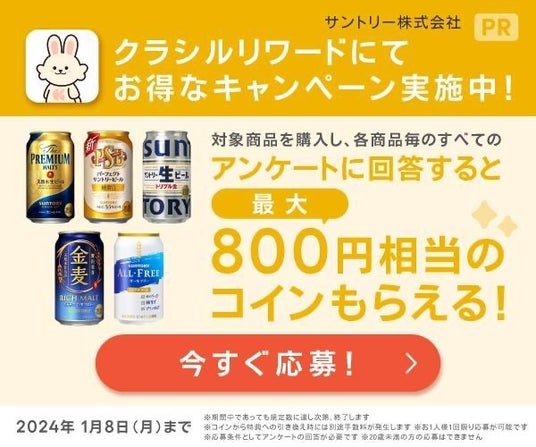 国内No.1の買い物サポートアプリ「クラシルリワード」(※1)は、2023年12月26日(火)~2024年1月8日(月)の期間、サントリーのビール類対象商品を購入後、レシートをアップしてアンケートに回答すると最大800円相当のポイントを付与する「レシチャレキャンペーン」を実施します。