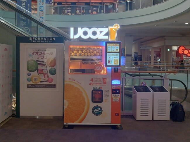 IJOOZのオレンジジュース自動販売機が「イオンモール橿原」の2F サンシャインコート エスカレーター横で稼働開始しました。施設を利用する一人でも多くの方に、手軽に美味しいオレンジジュースを楽しんでいただければと考えています。