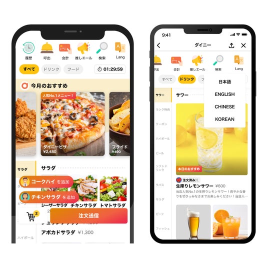 写真や動画が表示される、見やすいメニュー画面。お店のこだわりや雰囲気が伝わります。同席者の注文もリアルタイムで表示。食べ飲み放題にも対応し、残り時間が一目で確認できます。言語は日本語・英語・中国語・韓国語に対応。