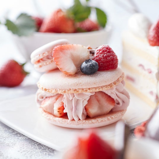 ラズベリージャムを合わせたほんのり甘いピンク色のチーズクリームをマカロンでサンド。トップにハート型の苺を飾り、バレンタイン仕様に。苺とクリーム、サクサク食感のマカロンのハーモニーが楽しいスイーツです。