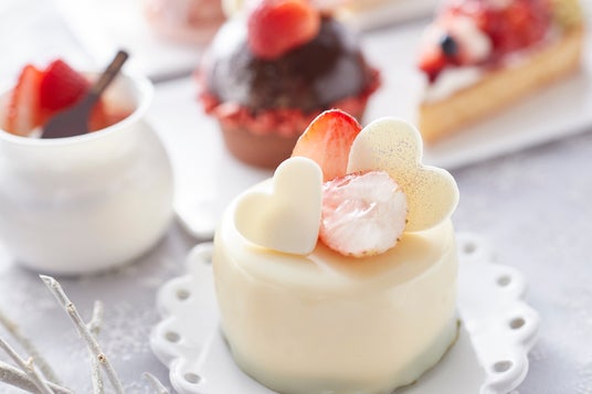 ホワイトチョコムースの中にほろ苦い抹茶ムースとマンゴーの華やかな香りのジュレを包み込んでいます。ハート型のホワイトチョコをトッピングした、“ホワイトバレンタイン”をイメージしたケーキです。