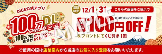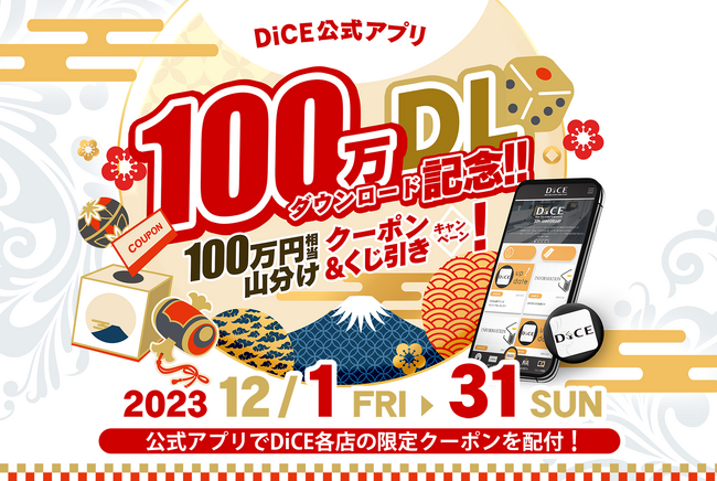 当社のグループ会社、株式会社ディスクシティエンタテインメント(本社:神奈川県横浜市、代表取締役:三田大明)が運営するインターネットカフェ「DiCE(ダイス)」は、『DiCE公式アプリ』100万ダウンロード突破を記念し、2023年12月1日(金)~ 12月31日(日)の期間、DiCEで利用できる「限定クーポン」をDiCE公式アプリにて配信いたします。