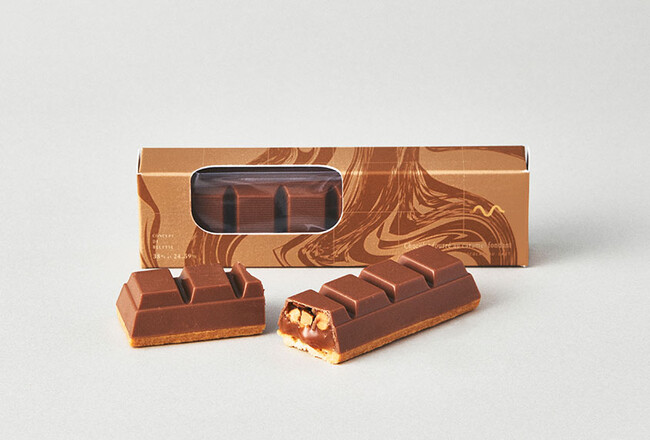 キャラメルの濃厚な甘さに、香ばしいクッキーとナッツの食感がアクセント。なめらかなオリジナルミルクチョコレートが口のなかで絡み合い、ひとくちで満足感のある “とろける”時間を演出します。厚めのチョコレートをパキッと割ると、たっぷり入ったキャラメルがとろりと溶け出す、魅力的な断面に魅せられて。