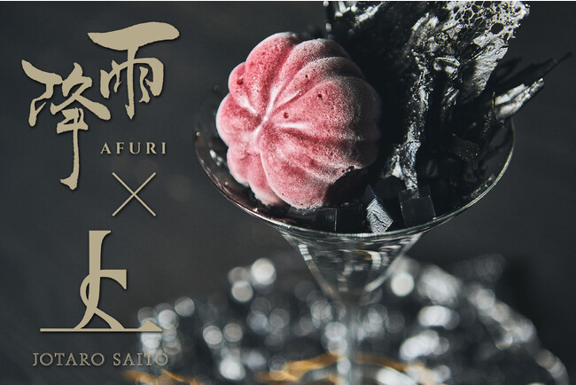 場所はキモノデザイナー・アーティスト斉藤上太郎氏が手掛けるJOTARO SAITO CAFE GINZA SIX 店の限定発売です。日本酒「雨降(あふり)」とスイーツのマリアージュをぜひお楽しみください。