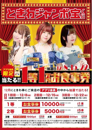 期間中、全国の「0秒レモンサワー(R)仙台ホルモン焼肉酒場 ときわ亭」に来店しアプリポイントを付与された方全員を対象に、条件を満たした方の中から抽選で2024年1月15日(月)よりときわ亭店舗(一部店舗を除く)で利用可能な食事券やアプリポイントが当たります。