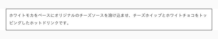 冬におすすめのドリンクメニュー「とろけるチーズのクリーミーモカ」は、ビターなエスプレッソとホワイトチョコシロップを使用したホワイトモカをベースに、チェダーチーズが入ったオリジナルのチーズソースを溶け込ませ、チーズホイップとホワイトチョコをトッピングしたコクのある味わいです。