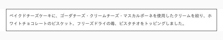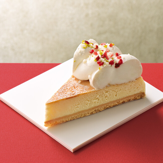 午後のティータイムにおすすめのスイーツメニュー「3種のこだわりチーズタルト」は、クリームチーズを使用した重厚感のあるベイクドチーズケーキに、ゴーダチーズ・クリームチーズ・マスカルポーネの3種類のチーズを使用したクリームを絞り、ホワイトチョコレートのビスケット、フリーズドライの苺、ピスタチオをトッピングした、チーズ感を存分に味わえるケーキです。見た目も華やかでホリデーシーズンにもおすすめです。