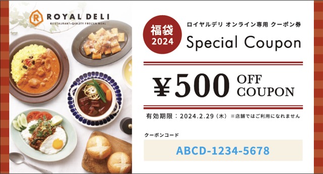 「福袋 2024」をご購入のお客様全員にロイヤルデリオンラインストア限定で次回ご利用いただける500円割引クーポンをプレゼントいたします。(有効期限:2024年2月29日(木))