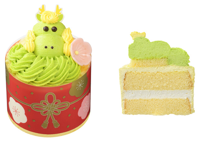 特長:2024年の干支の”辰(たつ)”をモチーフにした縁起のいいお正月限定ケーキです。ヨーグルト風味クリームをスポンジでサンドし、青りんごクリームで辰の顔と体を表現しました。スポンジのふんわり食感と、2種類のクリームのさわやかな風味をお楽しみください。おせち料理のあとはスイーツで、みんなにっこりスイーツ初め(R)♪