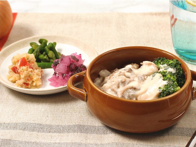 副菜は、赤ピーマン入りのマッシュポテトサラダ、トマトドレッシングで和えたアスパラピーマンマリネ、赤玉葱と柴漬けを合わせたオニオンピクルスです。濃厚な主菜とさっぱりな副菜がベストマッチです!