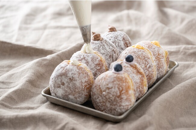 2号店となる『.donut factory』 では、1号店で人気の出来立て生ドーナツはもちろん、はちみつやチョコレートをコーティングしたものや生クリームなどが入ったドーナツを24種類提供します。また、2号店限定として日本各地のフルーツを使った生ドーナツを販売。オープン時には、神戸いちご、淡路島なるとオレンジ、鳥取花御所柿のドーナツが登場します。