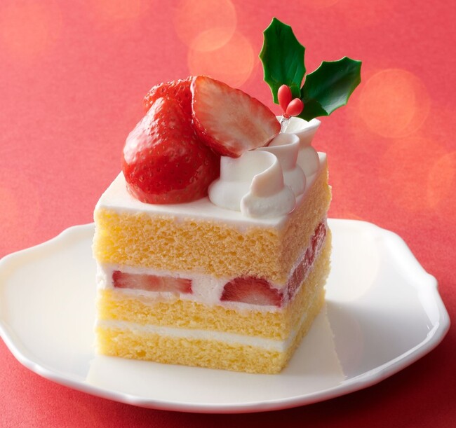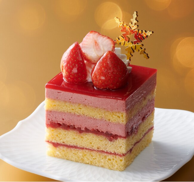 【商品説明】甘酸っぱい苺のムースと苺の果肉をアーモンドスポンジでサンドした華やかなケーキ。