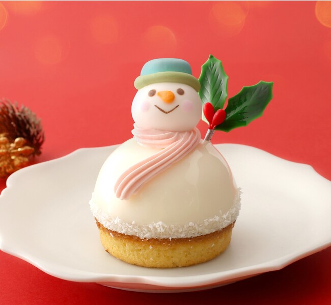 【商品説明】さわやかなオレンジのクリームを包んだレアチーズケーキのスノーマン。アーモンドケーキにのせて。