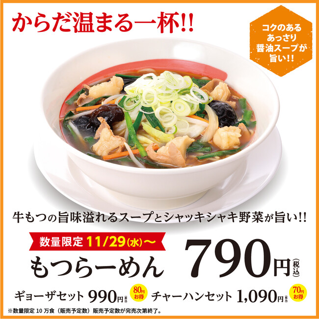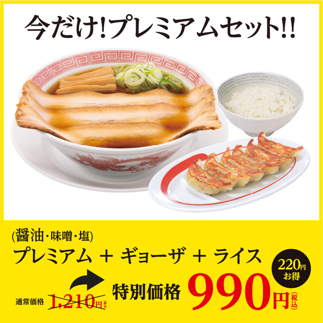 また、数量限定(10万食)の「もつらーめん」790円(税込)、プレミアム(醤油・味噌・塩)にギョーザとライスをセットにした「プレミアムセット」を特別価格の990円(税込)で販売いたします。