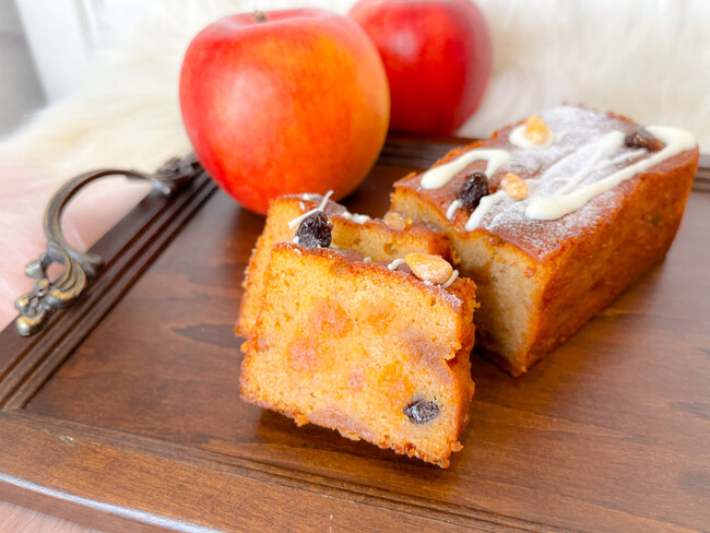 キャラメリゼしたりんごをダイレクトに生地に混ぜ合わせ、しっとりと焼き上げました。
