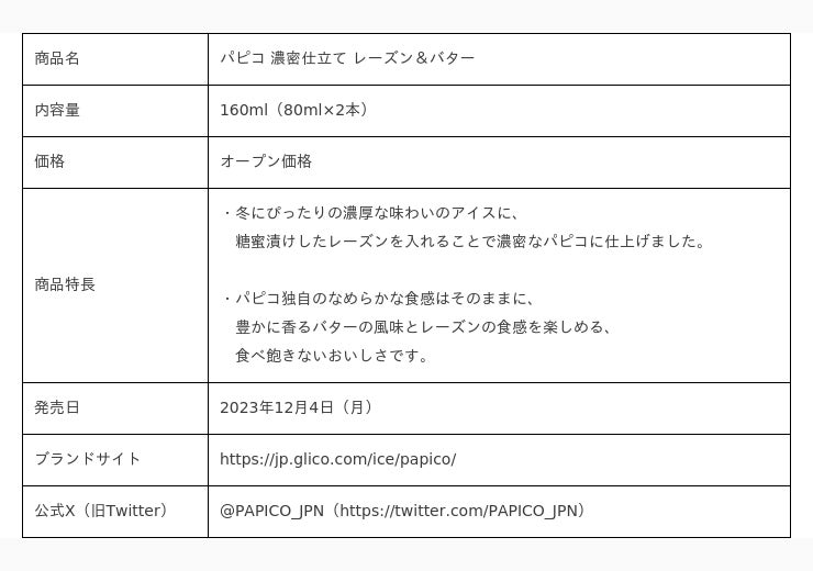 「濃密仕立て」にふさわしい、香り豊かなバターの風味のクリームとレーズンの味わいや食感をしっかり楽しんでいただけるような新しい「パピコ」を提供したい、という思いを込めて開発しました。最適な風味バランスを求めて何度も試行錯誤を重ね、冬の時期にぴったりな濃厚で充実感のある味わいと食感を実現することができました。クリームとレーズンが織りなす豊かな余韻で最後までおいしく召し上がっていただけます。新しいおいしさを存分にお楽しみください。
